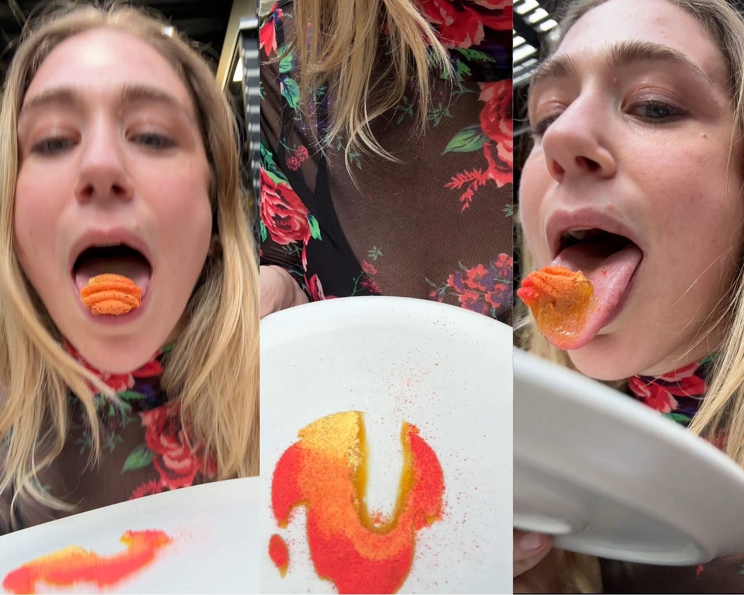 He opened with his signature yogurt explosion, the same dish he demoed the day before at Alimentarte. A single spoonful that, as he says, made him millions… and lost him millions. Then came the greatest hits: Lick It Up, plated in the shape of a flame emoji, made from passion fruit and fiery chile. Unlike in Bangkok, the Kiss song didn’t blast in the background, but the energy was there. I tried to film myself doing it—last time I licked up a carrot plate, and regretted not getting it on camera. Turns out licking and filming at the same time is harder than it looks. I’ll need to work on my technique, or at least bring a tripod next time.