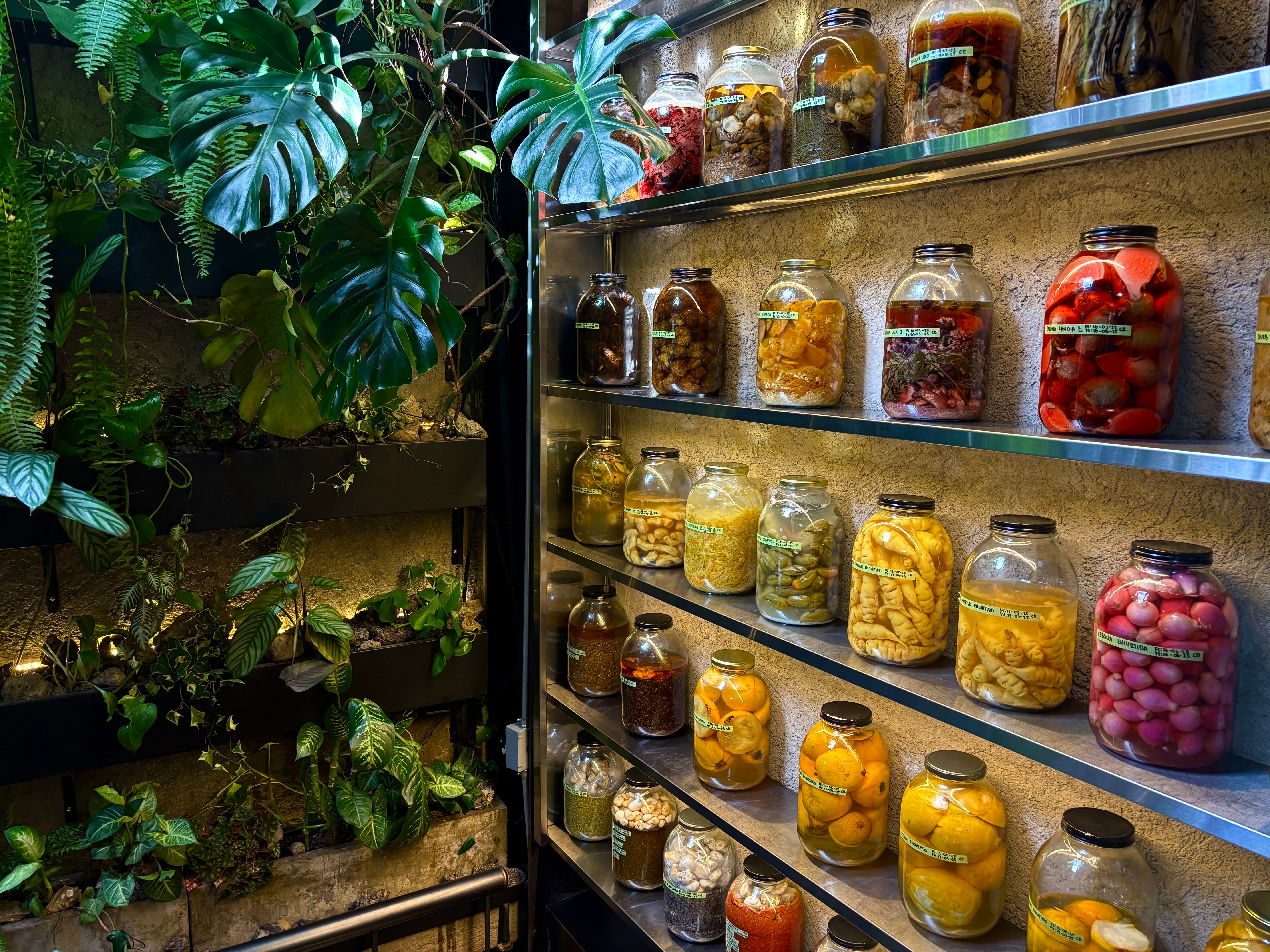 Upstairs at El Chato, the walls hold the essence of the menu itself, lined with glowing jars of ferments, spices, and pickles — an edible library of Colombian biodiversity. These jars aren’t just decoration. They’re the flavor archive, the building blocks behind nearly every dish.